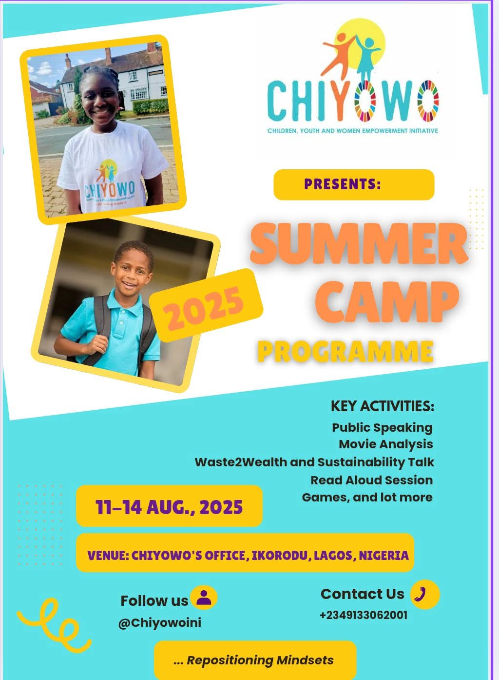 ChiYoWo is set to organize a 4-day Summer Camp Programme for primary school pupils in Lagos, Nigeria. The programme will run from Monday, August 11th to Thursday, August 14th, 2025, and will feature training sessions on: